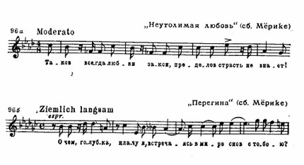 Здесь уместно будет вернуться к сопоставлению творческих методов Брамса и Вольфа, полярных по своим установкам. Для первого главное (в этом он опирается на Шуберта) — уловить и запечатлеть общее настроение стихотворения. Отсюда преобладание песенного начала и преимущественный интерес к строфическому строению с использованием элементов варьирования (Но коль скоро разные строфы стихотворения поются на ту же (или несколько варьированную) мелодию, возникают некоторые погрешности в просодии (то есть в произнесении текста), за что Вольф критиковал Брамса.). Иное у Вольфа: он воспроизводит развитие мысли поэта и контраст в смене поэтических образов и потому предпочитает «сквозную» форму. Важно и другое: в построении песни Брамс следует чисто музыкальным принципам, тогда как Вольф стремится отобразить в музыке все смысловые «изгибы» содержания текста. В свою очередь декламация затрудняет использование повторности интонационно-ритмических формул. Вследствие этого сильно возрастает объединяющая роль фортепианного сопровождения, которое, однако, никогда не заглушает певца (Чтобы усилить колористические краски сопровождения, в двадцати пяти своих песнях Вольф сделал его переложение для оркестра.).